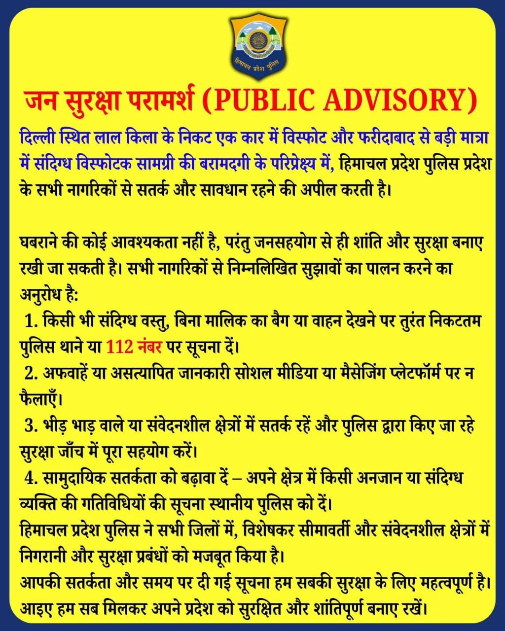 हिमाचल पुलिस ने लोगों से भी अपील की है कि वे सतर्क रहें, किसी भी संदिग्ध व्यक्ति या वस्तु की जानकारी तुरंत पुलिस को दें, ताकि राज्य में शांति और सुरक्षा बनाए रखी जा सके.