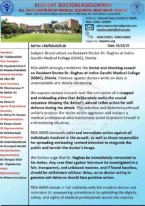 आरडीए एम्स ने स्पष्ट किया कि आत्मरक्षा में कार्रवाई करने वाले किसी भी डॉक्टर को दंडित नहीं किया जाना चाहिए। संगठन ने डॉ. राघव के साथ पूर्ण एकजुटता जताते हुए देशभर के चिकित्सा पेशेवरों की गरिमा, सुरक्षा और अधिकारों की रक्षा के प्रति अपनी प्रतिबद्धता दोहराई है।