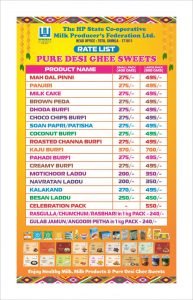 इस संबंध में मिल्कमेड विभाग के एमडी भूपेंद्र अत्री ने बताया कि मिल्कफेड विभाग प्रतिवर्ष दिवाली पर मिठाइयां बनाता है और बाजार में उतारता है उनका कहना था कि इस साल 500 क्विंटल मिठाई है बनाने का लक्ष्य है उन्हें कहा कि लोगों की मांग को देखते हुए इस बार 100 क्विंटल मिठाई अधिक बनाई जा रही है उनका कहना था कि लोगों को यह मिठाइयां आसानी से मिल सके इसके लिए सभी जिलों के बस अड्डे पर काउंटर रहेगा इसके अलावा विभिन्न जगह में भी अकाउंट लगाया गया है उन्होंने कहा कि शिमला कांगड़ा और मंडी में विशेष गाड़ी में भी मिठाई भेजी जाएगी जो कि जगह जगह पर जाकर लोगों को दिवाली की मिठाई बेचेगा उन्होंने कहा कि मिल्कफेड में बनी मिठाइयों की खासियत यह रहती है कि यह शुद्ध देसी घी से बनाए जाते हैं और इसके प्रमाणिकता की जांच भी करवाई जाती है उसके बाद है इसे बाजार में उतारा जाता है उनका कहना था कि दिवाली के समय लोगों को अच्छी मिठाई मिल सके इसके लिए मिल्कफेड विभाग ने पहले से ही तैयारियां कर रखी है उनका कहना था कि इस बार मिठाइयों में बर्फी गुलाब जामुन लड्डू क्रीमी बर्फी पंजीरी अन्य विशेष मिठाईयां बेची जाएगी उनका कहना था कि मिल्कफेड विभाग में लोग दूर-दूर से आकर मिठाइयों की डीलरशिप ले रहे हैं भूपेंद्र अत्री ने बताया कि हमारी मिठाई की गाड़ियां शुरू हो गई है और विभिन्न जिलों में बेचे जा रहे हैं